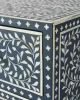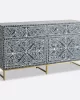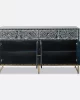A bone inlay blue buffet is a stunning piece of furniture that adds a touch of elegance to any room. The intricate and delicate designs are crafted by skilled artisans who embed small pieces of bone on a wood base, resulting in a beautiful and unique piece that catches the eye. The black color of the buffet provides a dramatic backdrop for the white bone inlay, creating a striking contrast that adds depth and dimension to the piece. The bone inlay blue buffet is not only beautiful but also functional, providing ample storage space for your belongings. The drawers and cabinets are spacious and well-designed, making it easy to organize and store your items. The buffet is also versatile, making it a great addition to any room in your home.