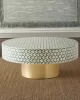 The bone inlay center table brass is a stunning piece of furniture that can add a touch of sophistication to any living room. Expertly crafted by skilled artisans, this coffee table features intricate patterns and designs made from a variety of materials such as wood, bone, and mother of pearl. The round shape of the table is perfect for creating a cozy and intimate atmosphere in your living room. The handmade coffee table is not only beautiful but also functional, providing a convenient surface to place your drinks, snacks, or other essentials. The bone inlay center table brass is perfect for those who appreciate unique and high-quality furniture that can elevate the style of their living room.