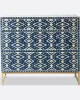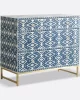 Crafted from a variety of materials including wood, bone, and mother of pearl, the bone inlay three drawer dresser is a stunning piece of furniture that will add a touch of elegance to any room. Skilled artisans have designed intricate patterns and designs on the drawer, making it a beautiful addition to your home. The rich blue color of the dresser is truly eye-catching and will add a pop of color to any room. Apart from being beautiful, the dresser is also highly functional, providing ample storage space for your belongings and essentials. The drawers are easy to open and close, and the dresser is built to be sturdy and durable. If you appreciate unique and high-quality furniture, this bone inlay three drawer dresser is perfect for you.